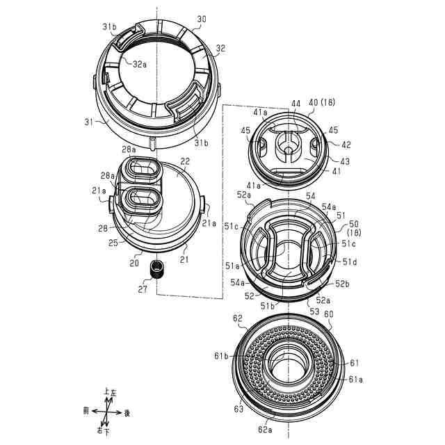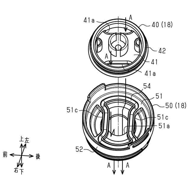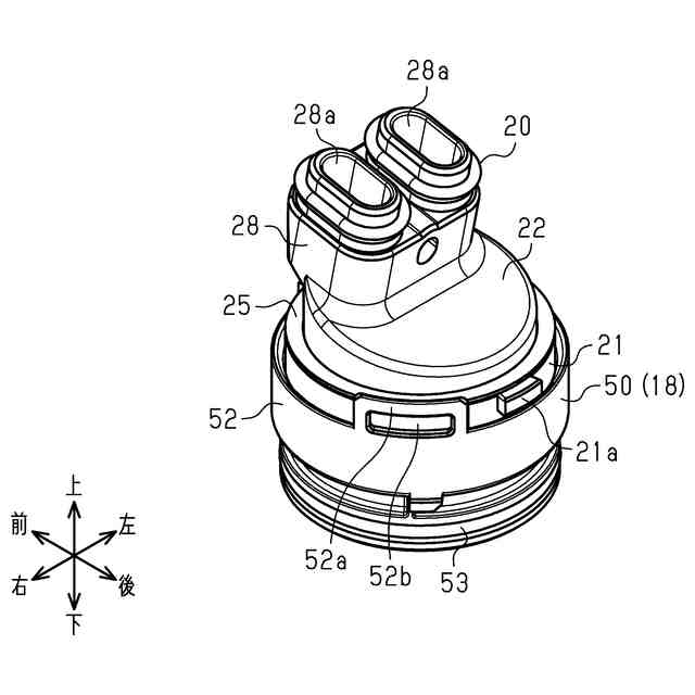 回動部材72は、筒状に構成されている。回動部材72は、上端部に凹部72cを有しており、凹部72c内に、ストレート吐水用導水口72aと、シャワー吐水用導水口72bを2つずつ有している。この凹部72cにシール部材73が収容される。
