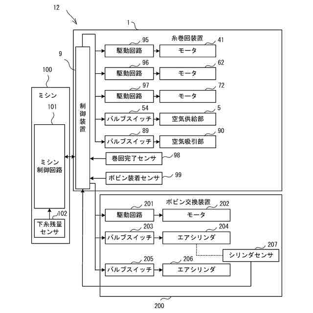 前記ボビン回転部と、前記ノズル回動部と、前記空気供給部とを制御する制御装置と