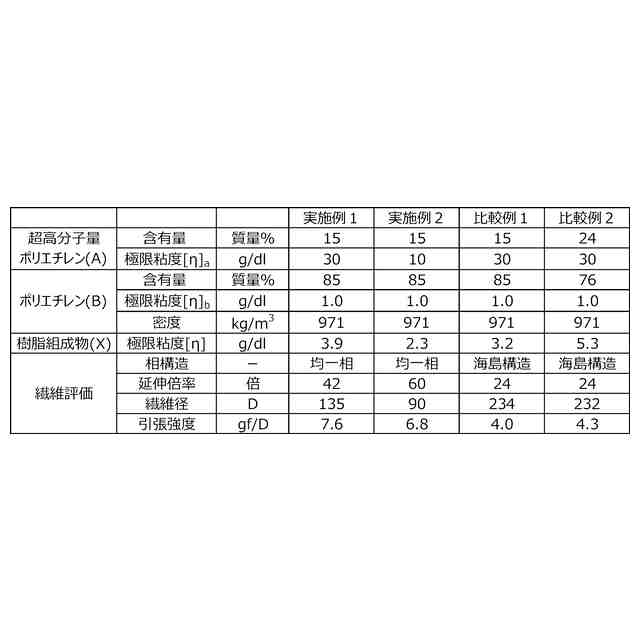 【解決手段】要件(a-1)を満たす超高分子量ポリエチレン(A)5~40質量部と、要件(b-1)および(b-2)を満たす低分子量ないし高分子量ポリエチレン(B)95~60質量部とを含み、135℃のデカリン溶媒中で測定した極限粘度[η]が1.5~15dl/gの範囲であり、かつ、少なくとも一部が均一相を形成している、繊維(Y):(a-1)135℃のデカリン溶媒中で測定した極限粘度[η]が8~50dl/gである;(b-1)135℃のデカリン溶媒中で測定した極限粘度[η]が0.1~5dl/gである;(b-2)密度が950~985kg/m