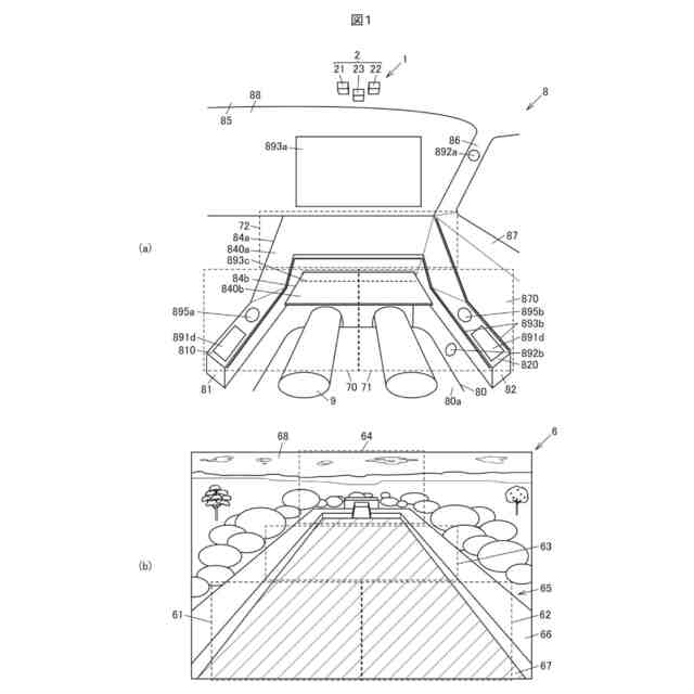 図1(a)は、実施の形態に係る車両用体験システムが搭載された車両の一例を示す図であり、図1(b)は、投影するコンテンツの一例を示す図である。