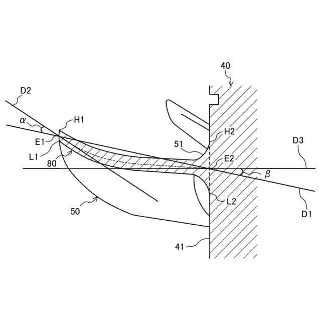 前記第3端部(E1)と、前記翼部(50)の前記径方向の内方の端部である第4端部(E2)とを通る直線は、前記第4端部(E2)から前記第3端部(E1)にかけて前記流れ方向の上流側へ向かうように延びる。