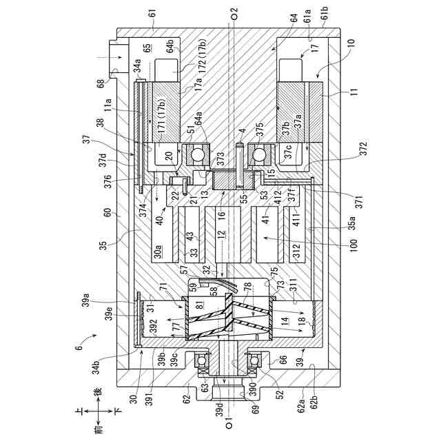 駆動スクロールには駆動軸が形成されている。駆動軸は円筒状をなしており、内部にボスを収容している。駆動軸とボスとの間、より具体的には、駆動軸の内周面とボスの外周面との間には軸受が設けられている。駆動軸は外周面が駆動機構に固定されている。こうして、駆動スクロールは、ハウジング内において駆動機構と固定されているとともに、軸受を介してボスに駆動軸心周りで回転可能に支持されている。
