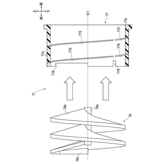前記螺旋部材は、前記駆動軸心方向に直線状に延びる中心軸部と、前記中心軸部と一体をなし、前記駆動軸心周りに螺旋状に延びる羽根部とを有し、