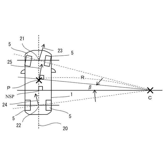 これに対し、仮にたとえば車両のニュートラルステアポイントの位置や重心の位置などを固定的に、旋回進路を予測する際の演算始点位置として用いる場合、または、自動車が演算開始位置からの一定の旋回半径に沿う定常円旋回により移動するとした場合、それらによる予測進路には、旋回中の車両に実際に作用する横滑りなどの車体挙動が考慮されていない。その結果、それらに基づいて予測される旋回中の予測進路は、実進路とのずれが大きくなり易い。このような横滑りなどの車体挙動を考慮していない旋回中の予測進路であっても、一定の実用性を得ることはできるが、実際には干渉することがない走行障害物との干渉を過剰に判断したり、実際には干渉することになる走行障害物との干渉を不足して判断したり、現実にはそぐわない過不足のある判断をしてしまう可能性が高まる。特に、平地のカーブではなく下り坂または上り坂の勾配があるカーブで旋回する場合や、旋回中に加減速する場合においては、大きな車体挙動が生じ易く、ずれが大きくなりやすい。