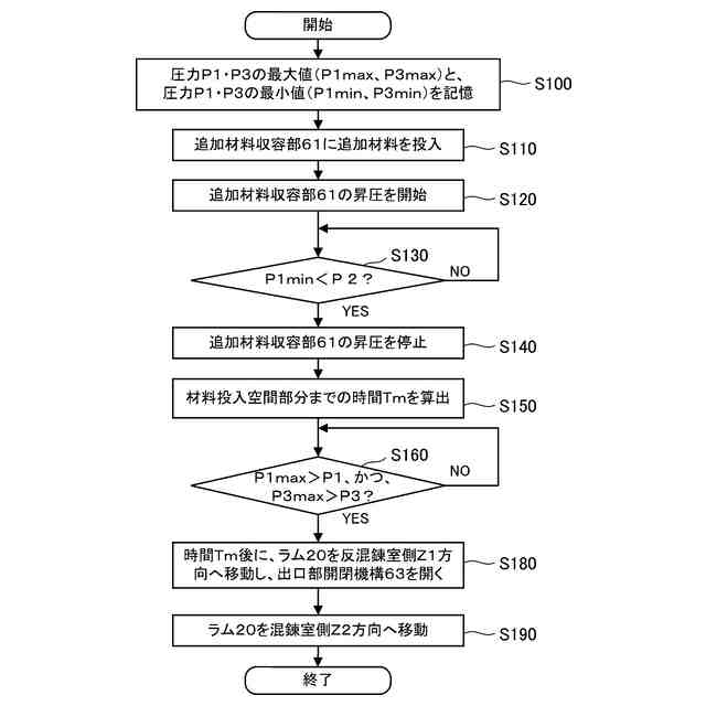 前記制御部は、前記ロータを回転させている状態で、前記第2圧力計で検出された前記圧力P2>前記最小圧力P1min、且つ、前記最大圧力P1max>前記第1圧力計で検出された前記圧力P1であることを検知してから前記時間Tm後に、前記出口部開閉機構を開にすることで前記追加材料収容部から前記混練室へ前記追加材料を供給する、
