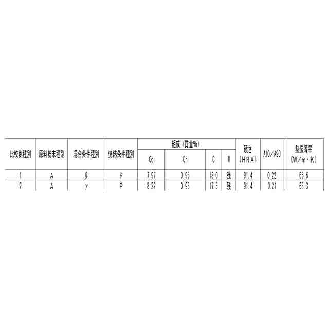 特許文献2では、平均粒径0.4~4.0μm以下のWCを硬質相とし、CoおよびNiの合計含有量を4.5質量%以上15質量%以下とし、WCの平均粒径をx(μm)とするとき、その熱拡散率χ(cm