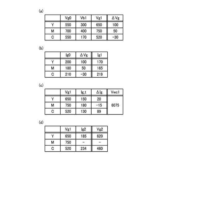 具体的には、制御部は、濃度補正により決定した各色の現像電圧Vb1に所定の電位差ΔVを加えることで、各色の第1グリッド電圧Vg1を計算する。