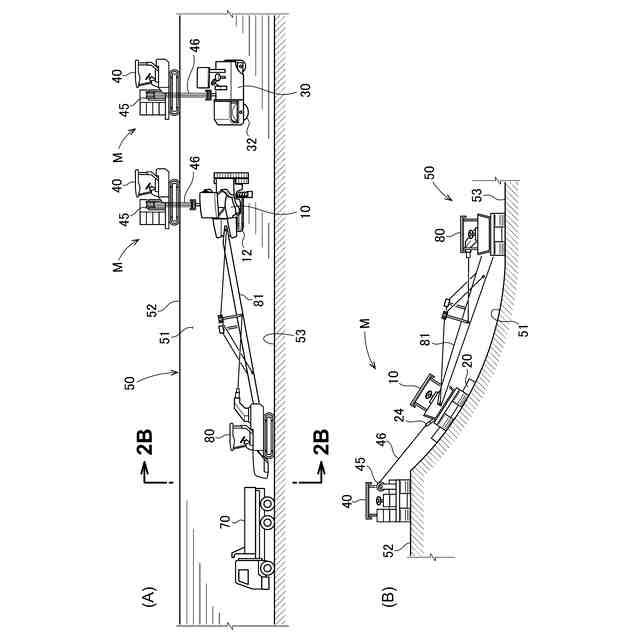 また、特許文献2のバンクを舗装する施工技術は、アスファルトフィニッシャを用いて、フィルダムの傾斜する基面(バンク)に、アスファルト混合物を敷き均すものである。アスファルトフィニッシャは、基面(バンク)の天端に設けられた自走式けん引装置によって、フィルダムの法面上を引き上げられる。また、アスファルトフィニッシャの後方には、アスファルト混合物を敷き固めるための、ローラ車が配置されている。ローラ車は、アスファルトフィニッシャに牽引されている。