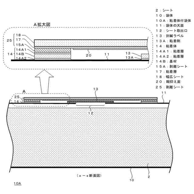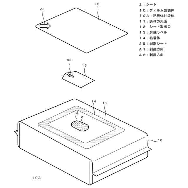 また、特許文献1に記載の袋体の天面には、樹脂蓋の枠部を固定するための粘着層が設けられているので、粘着層上には何らかの剥離シートが設けられていると認められる。特許文献1には、シート取出口を封じる封緘ラベルを、粘着層上の剥離シートとしても使用できるようにするのか、シート取出口を封じる封緘ラベルと粘着層上の剥離シートとを別個に設けるのかについて記載されていないが、いずれにしても、封緘ラベルを剥離除去した後に樹脂蓋が取り付けられるので、シート取出口からの液体の漏れに伴う上述の問題が生じる。また、仮にシート取出口を封じる封緘ラベルと、粘着層上の剥離シートとを別個に設けるとした場合でも、ユーザが一方の剥離時に他方も剥離してしまうことが懸念される。