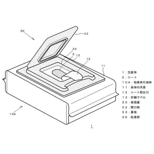 【解決手段】粘着体付袋体10Aが、液体を含有したシート2が収容されたフィルム製の袋体10の天面11に、シート取出口12、該シート取出口12を覆う封緘ラベル13、樹脂蓋取り付け用粘着体14、及び該粘着体14を覆う剥離シート15を有する。この粘着体14は封緘ラベル13の周囲に設けられている。樹脂蓋30は、シート取出用の開口部32と該開口部32を開閉する蓋板33とを有し、袋体10の封緘ラベル13が樹脂蓋30の開口部32内に入る大きさを有し、粘着体14が基材14Bとその両面の粘着層14A1、14A2で形成されている。