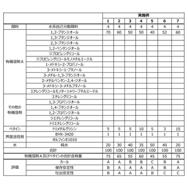 実施例において用いるインク組成物の組成及びその評価結果を示す表1である。