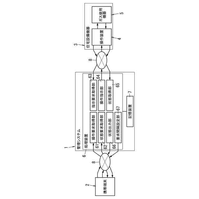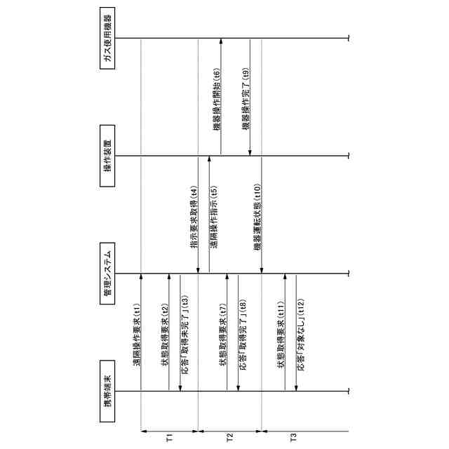 請求項4の発明に係る管理システムは、請求項1又は2の発明に係る管理システムにおいて、前記状態出力部は、前記操作要求取得部で前記遠隔操作要求が取得される時点から前記指示要求取得部で前記指示要求が取得される前の期間では、前記住宅設備機器が前記操作指示を取得していない状態を示す第1状態区分を前記状態情報として前記携帯端末に出力する。前記状態出力部は、前記指示要求取得部で前記指示要求が取得される時点から前記状態取得部で前記機器運転状態が取得される前の期間では、前記住宅設備機器が前記操作指示を取得した状態を示す第2状態区分を前記状態情報として前記携帯端末に出力する。前記状態出力部は、前記状態取得部で前記機器運転状態が取得される時点からの期間では、前記操作指示に基づく運転を前記住宅設備機器が完了した状態を示す第3状態区分を前記状態情報として前記携帯端末に出力する。