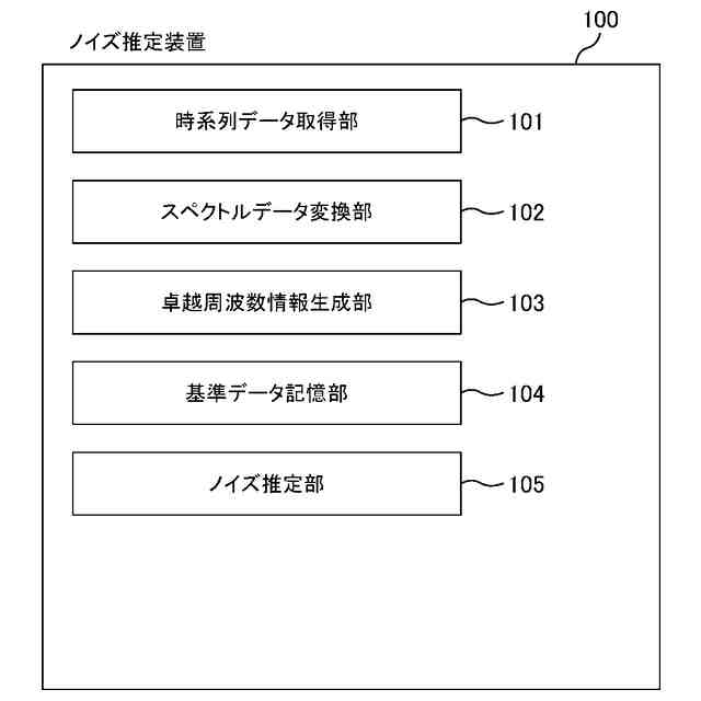 【解決手段】センサで計測された物理量の時系列データに混入しているノイズの種類を推定するノイズ推定装置であって、時系列データを取得する時系列データ取得部と、時系列データに周波数分析を行うことで、時系列データを周波数と信号強度との関係を表すスペクトルデータに変換するスペクトルデータ変換部と、スペクトルデータから複数の卓越周波数を特定し、卓越周波数と信号強度とを対応付けた卓越周波数情報を生成する卓越周波数情報生成部と、混入したノイズの種類が判明している卓越周波数情報である基準データをノイズの種類ごとに記憶する基準データ記憶部と、推定対象データと各基準データとの類似の程度に応じて、推定対象の時系列データに混入しているノイズの種類を推定するノイズ推定部と、を備える。