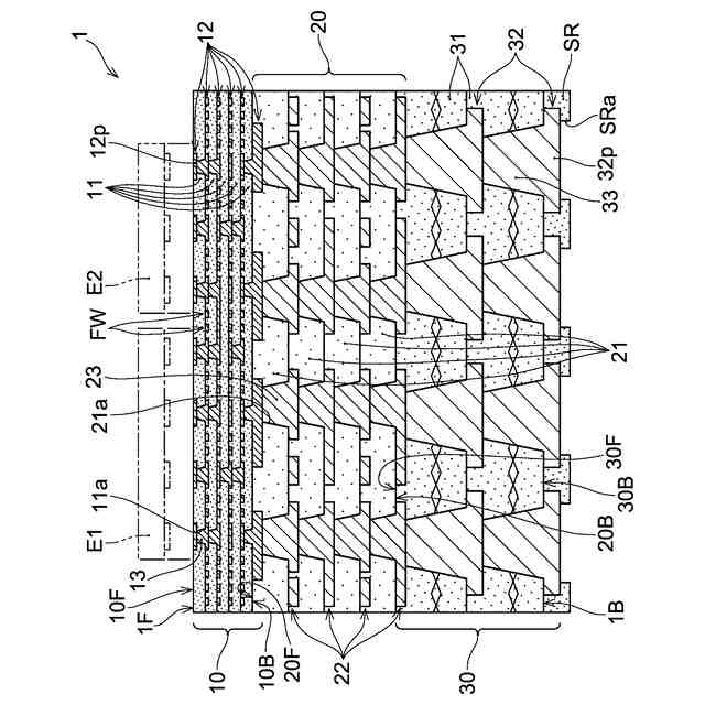 ビルドアップ部10は、第1面10Fと反対側の表面として第2面10Bを有している。図1に示されるように、配線基板1は、ビルドアップ部10の第2面10B側に、交互に積層される絶縁層および導体層から構成されるビルドアップ部20、30をさらに含み得る。以下、配線基板1の説明において、ビルドアップ部10は第1ビルドアップ部10とも称され、ビルドアップ部20は第2ビルドアップ部20とも称され、ビルドアップ部30は第3ビルドアップ部30とも称される。
