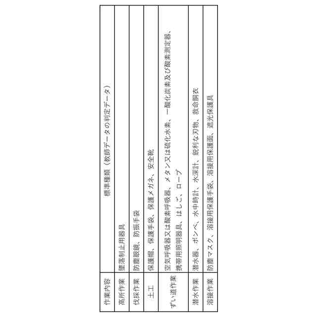 第2の発明は、第1の発明において、判定データは、不備の有無と、不備種類に加えて、作業者が実施する作業の作業種類を含み、作業種類は、不備種類と、不備がない場合の安全装備品の標準種類にそれぞれ対応しており、作業前判定データは、作業種類毎の、作業前不備の有無と、安全装備品の作業前不備種類であることを特徴とする。