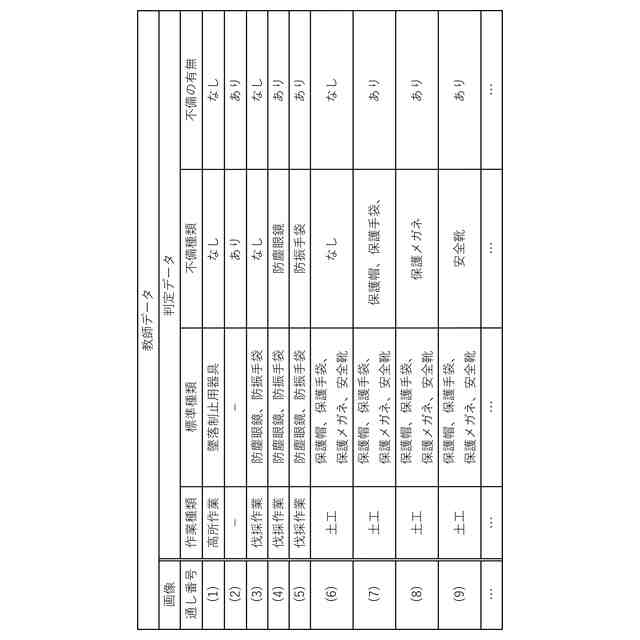 さらに、安全装備品の着用に関する不備の有無とは、作業者が必要な安全装備品のいずれかを着用していない、又は着用していることをいう。そして、安全装備品の不備種類とは、作業者が着用していない安全装備品の、具体的な物品の名称をいう。