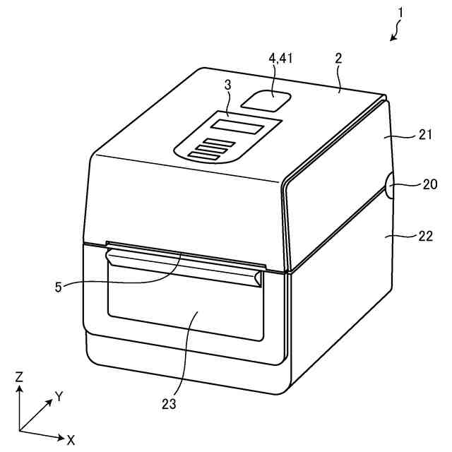 なお、説明の便宜のため、三次元座標系を併せて示す。プリンタ1の幅方向(左右方向)をX軸方向とし、奥行方向(前後方向)をY軸方向、高さ方向(上下方向)をZ軸方向とする。Y軸の正方向は手前側から奥側へ向かう方向であって、Y軸の正方向に見た状態が正面視である。