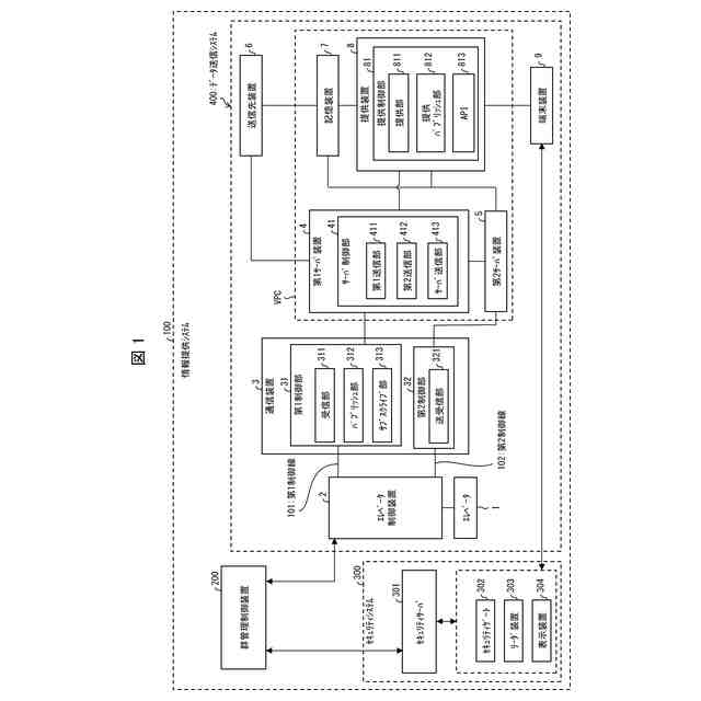 以下、本発明の一実施形態について説明する。図1は、本発明の実施形態1に係る情報提供システム100の構成を示すブロック図である。図1に示すように、情報提供システム100は、群管理制御装置200、セキュリティシステム300、およびデータ送信システム400を含む。本発明に係る情報提供システム100は、複数階床を有する建物に設けられた複数の号機を備えるエレベータ1の号機の動作状況に関する動作情報を提供するシステムである。