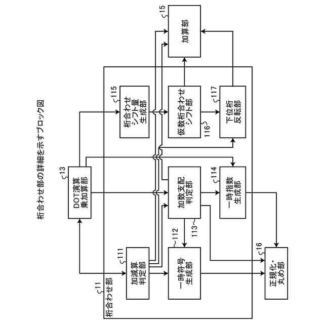 しかしながら、1回の融合乗加算に特化した従来のFMA演算器は、積の符号に対して、積の結果に加えられる加数が同符号なら実質加算として処理を行い、異符号なら実質減算として処理を行う。浮動小数点における実質加算と実質減算は、処理の性質が大きく異なる。そのため、積の符号を早期に見定め、後続の内部処理が実質加算又は実質減算のいずれになるのかを、演算の早期に確定させておくことが望ましい。これに対して、DOT演算の場合、最終的に累積される値は正負いずれもありうる複数の積の和となり、累積する値の符号が、即座には確定できない。すなわち、実質加算を行うべきか実質減算を行うべきかが、早期に定まらないということになる。そのため、従来のFMA演算器では、DOT演算における一括加算を処理することが難しく、DOT演算も実行できるように演算機能を強化することは困難であった。