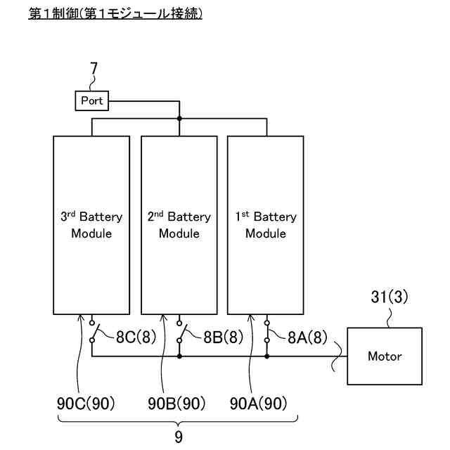 前記第1の態様によれば、前記制御装置は。前記複数の電池モジュールそれぞれのSOCを示すパラメータを検出する状態センサと、前記SOCセンサの検出信号に基づいて、前記複数の電池モジュールと、前記駆動源との間の電気的な接続を切り替えるコントローラと、を備え、前記コントローラは、前記状態センサの検出信号に基づいて、前記複数の電池モジュールのうちの少なくとも1つにおいて、前記SOCが所定の第1基準値以上であるか否かを判定し、前記SOCが前記第1基準値以上の場合、前記複数の電池モジュールを各々順番に前記駆動源に接続するとともに、前記複数の電池モジュールを、各々の前記SOCが前記第1基準値に低下するまで順番に放電させる第1制御を実行する。