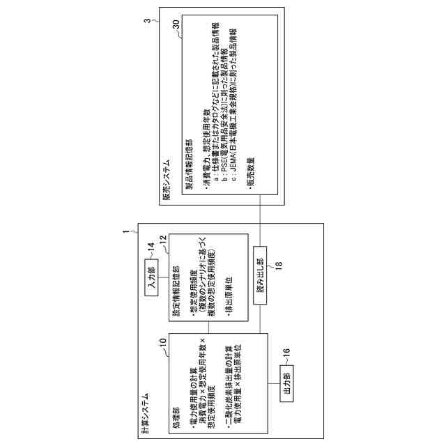 【解決手段】二酸化炭素排出量の計算システム1では、設定情報記憶部12と、製品情報を販売システム3から読み出す読み出し部18と、処理部10と、を備え、設定情報は販売した製品の想定使用頻度を含み、製品情報は消費電力および想定使用年数のうちの少なくとも一方を含み、処理部10は少なくとも消費電力、想定使用年数および想定使用頻度に基づいて電力使用量を計算し、計算した電力使用量に基づいて販売した製品の二酸化炭素の排出量を計算する。