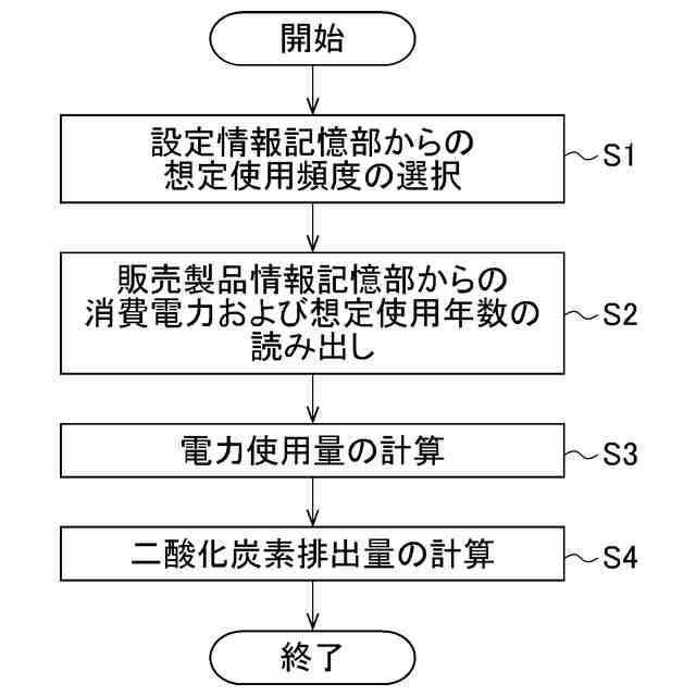 (4)本発明の二酸化炭素排出量の計算方法は、二酸化炭素排出量の計算方法であって、販売した製品の二酸化炭素排出量を計算するために必要な設定情報を設定する設定ステップと、販売した製品に関する製品情報を販売システムから読み出す読み出しステップと、販売した製品の二酸化炭素の排出量を計算する計算ステップと、を有し、前記設定情報は、販売した製品の想定使用頻度を含み、前記製品情報は、消費電力および想定使用年数のうちの少なくとも一方を含み、前記計算ステップは、少なくとも消費電力、想定使用年数および想定使用頻度に基づいて電力使用量を計算し、計算した電力使用量に基づいて販売した製品の二酸化炭素の排出量を計算する。