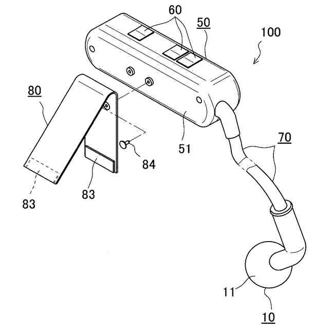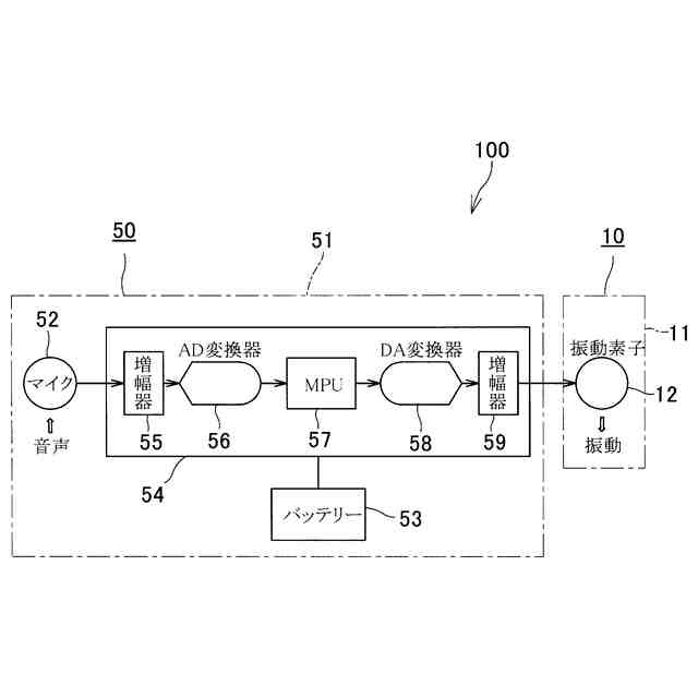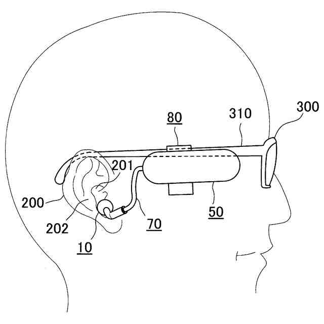 先行例1(特許文献1)には、眼鏡用アダプタに関して、当該アダプタのハウジングに設けた溝に眼鏡のつる(テンプル)を沿わせることにより、当該アダプタを眼鏡に装着することが記載されている。先行例2(特許文献2)には、補聴器付き眼鏡に関して、テンプル部の内側にL字状の引掛部を介して取り付けられた補聴器の前側に、マイク部が位置している構成が開示されている。先行例3(特許文献3)には、電磁式又は圧電式の音響信号を発生するトランスジューサー部の筐体部が、眼鏡の弦に対する摺動回転及び摺動移動可能な取り付け部を備えていると共に、上記筐体部に骨伝導スピーカーの振動板を取り付けて顔面の一部に接触させることが記載されている。