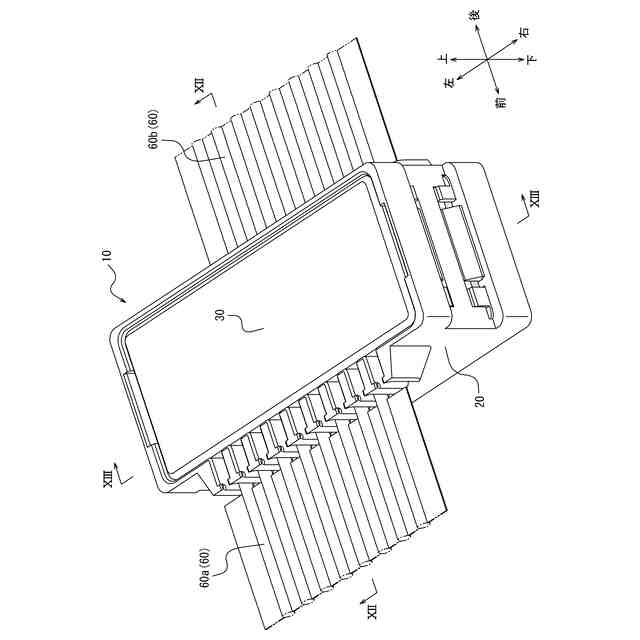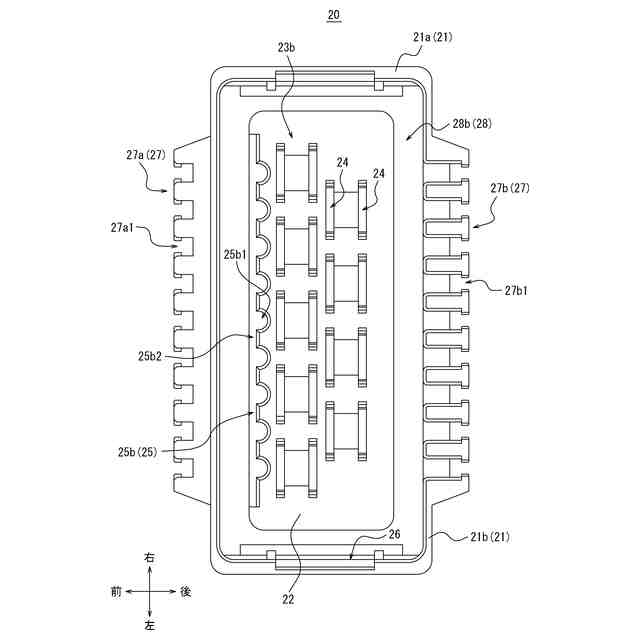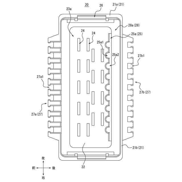前記第1収容部と前記第2収容部とは、前記延伸方向において互いに反対側に配置され、前記第1方向において互いに反対側から配置されている、