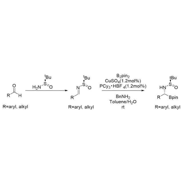 一方、アルデヒドから不斉補助基を有するイミンを経由してキラルなα-アミノボロン酸誘導体を製造する方法が知られている。例えば、出発原料であるアルデヒドとキラルtert-ブチルスルフィンアミドとを反応させて得られる不斉補助基を有するイミンと、ビス(ピナコラート)ジボロンとを、硫酸銅(II)、トリシクロヘキシルホスホニウムテトラフルオロボラート(PCy
