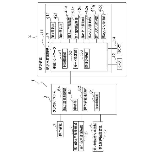 前記音声認識装置によって認識された前記解体オペレータの音声に基づいて、前記散水装置を操作する散水オペレータへ前記散水装置の制御に関する通知、または前記散水装置の制御を行うコントローラと、を備えた、