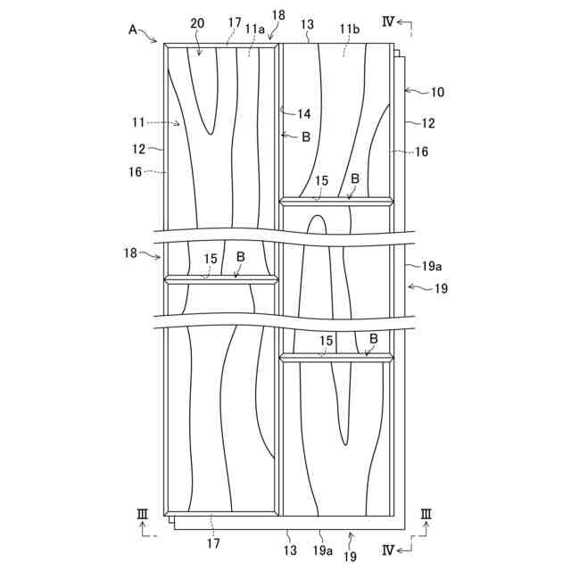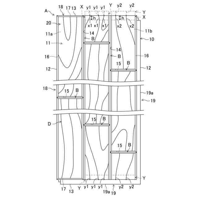 上記各化粧板において上記複数の第2表面部には、互いの異なる上記連続模様が形成されている