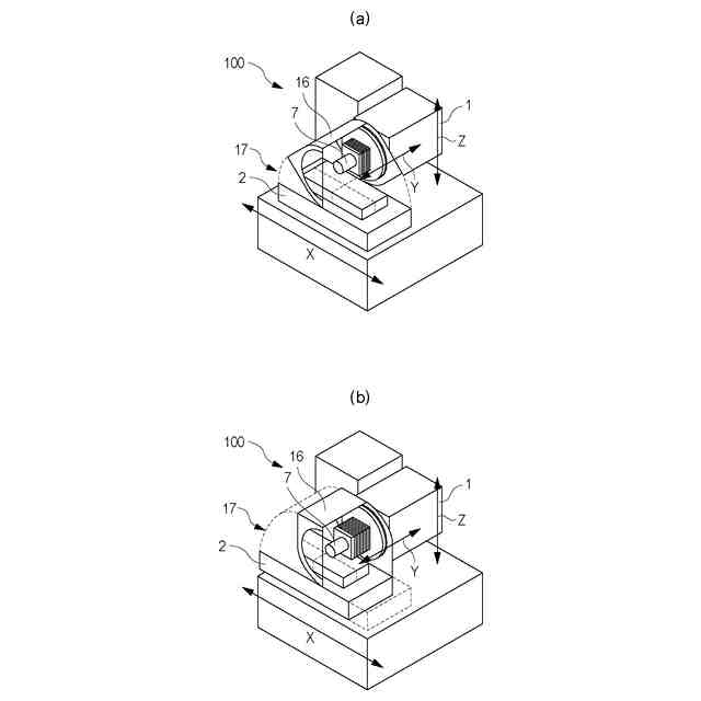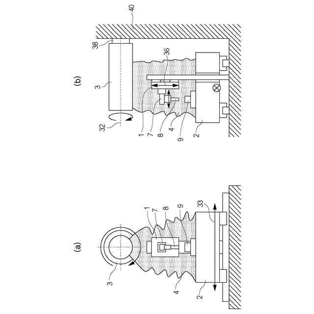 図1は、本発明の実施例1の加工装置の正面図(a)と側面図(b)です。上下方向に往復運動する第1手段1と、水平方向に往復運動する第2手段2があり、第1手段の移動軸36と交差し、且つ、第2手段の移動軸33とも交差する回動軸32を持つ接続部3が構造物40に取り付けられている。構造物40は部屋の壁や加工装置を覆う壁等でもよいが、加工装置付近で接続部3を固定できればよい。接続部3には、円形の開口部があり、構造物40に設けられた軸38を挿入することで、接続部3は回動可能となっている。接続部3の底面には、開口があり、第1手段1と第2手段2と被加工物9を覆うように、カバー4が取り付けられている。カバー4の開口の一方は接続部3に接続され、他方の開口は、第2手段に接続されている。被加工物を加工する第1手段1には、加工物8を取り付けるための工具取付部7が接続されている。被加工物9を固定する第2手段2と第1手段1及び工具取付部7を移動させることで被加工物9を加工する。