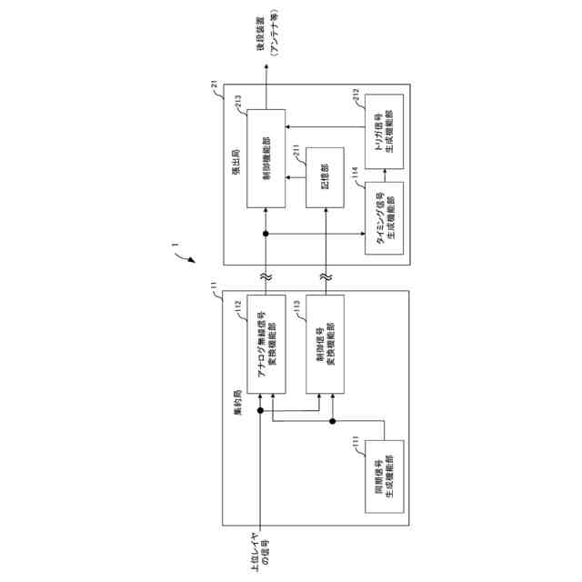 (1)上記の目的を達成するために、本発明は、以下のような手段を講じた。すなわち、本発明の基地局装置は、アナログRoF(Radio over Fiber)方式が適用されたフロントホールで接続された集約局と張出局を備える基地局装置であって、前記集約局は、各信号間の同期タイミングを調整するための同期信号を生成する同期信号生成機能部と、前記同期信号を基に、上位レイヤから送信された無線信号および前記無線信号を制御する制御信号を含む上位レイヤ信号を、アナログ波形であるアナログ無線信号に変換するアナログ無線信号変換機能部と、前記アナログ無線信号と同期したタイミングで切り替わるタイミング信号を生成するタイミング信号生成機能部と、前記制御信号から、張出局側で前記アナログ無線信号を制御するための張出制御信号を抽出する制御信号変換機能部と、を備え、前記張出局は、取得した前記張出制御信号を蓄積する記憶部と、前記タイミング信号が切り替わったタイミングで前記制御信号を読み出すトリガ信号を生成するトリガ信号生成機能部と、前記トリガ信号に基づき、前記記憶部に蓄積された張出制御信号を読み出し、前記アナログ無線信号を制御する制御機能部と、を備えることを特徴としている。