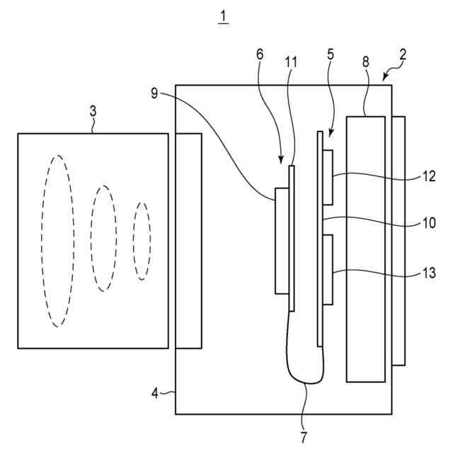 図1は、第1実施形態に係る電子機器の一例を示す模式図である。ここでは、電子機器として撮像装置であるデジタルカメラ1が示されている。デジタルカメラ1は、レンズ交換式のデジタルカメラであり、カメラ本体2を備える。カメラ本体2には、レンズを含むレンズユニット(レンズ鏡筒)3が着脱可能となっている。カメラ本体2は、筐体4と、処理モジュール5と、センサモジュール6と、を備えている。処理モジュール5およびセンサモジュール6は、筐体4の内部に配置されている。