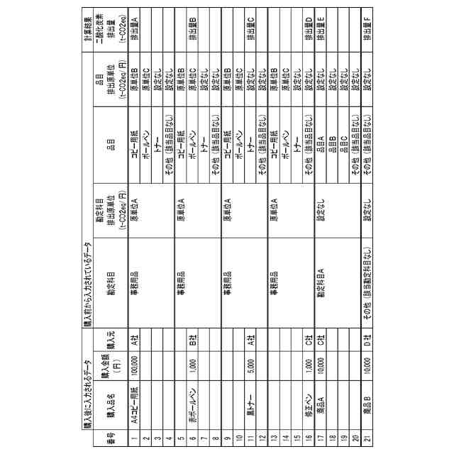 購入品の品名と、勘定科目と、勘定科目が細分化された品目と、勘定科目および品目のうちの少なくとも一方に設定された二酸化炭素排出量を計算する際に用いる排出原単位と、を含むデータが記憶された記憶部と、