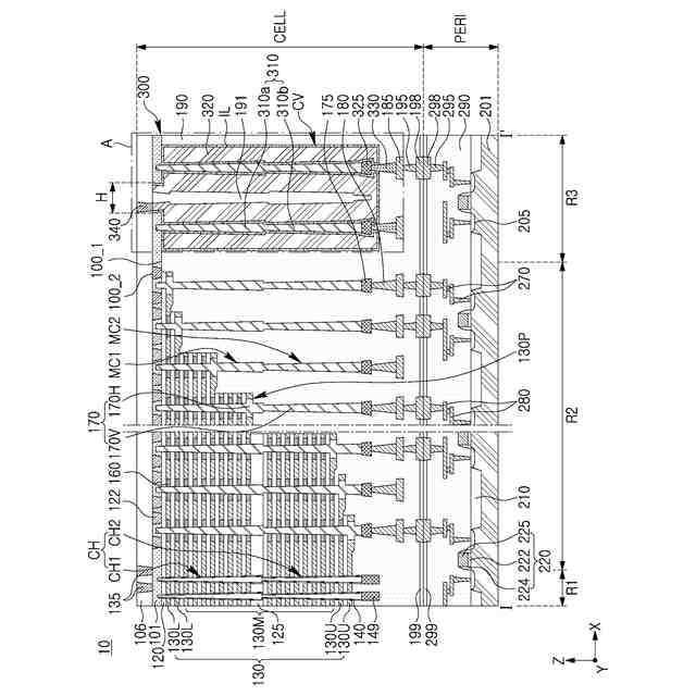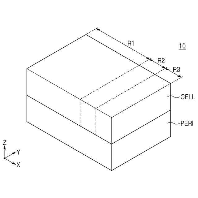 上記目的を達成するためになされた本発明の他の態様による半導体装置は、第1方向に順次配置されるセルアレイ領域、セルコンタクト領域、及び周辺領域を含む積層パターンと、前記積層パターン上で前記セルアレイ領域から前記セルコンタクト領域上に延び、層間絶縁層及びゲート電極が垂直方向に交互に配置される積層構造物と、前記セルアレイ領域で前記積層構造物を貫通して前記第1方向に交差する垂直方向に沿って延びるチャネル構造物と、前記セルコンタクト領域で前記ゲート電極及び前記層間絶縁層を貫通するコンタクトプラグと、前記周辺領域で前記積層パターン上に配置されて拡張キャビティを含むキャパシタ構造物と、を備え、前記キャパシタ構造物は、前記積層パターンの上面上に配置されて前記拡張キャビティによって少なくとも一部が収容される第1電極構造物と、前記拡張キャビティ内に配置される前記第1電極構造物及び前記拡張キャビティを覆う誘電体ライナーと、前記誘電体ライナー上に配置される第2電極構造物と、を含む。