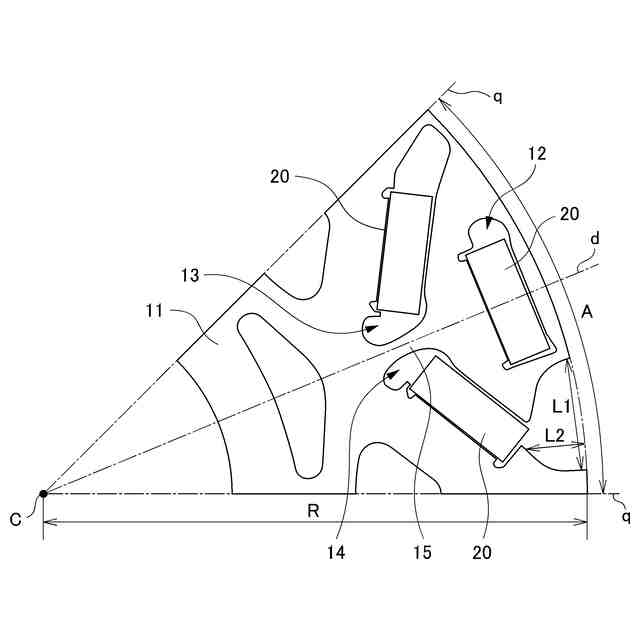 前記目的を達成するために、本発明は、円環状のロータコアを有し、前記ロータコアに、永久磁石を挿入固定することで周方向に等間隔で並ぶ複数の磁極を構成するための複数の孔が形成されている、回転電機のロータにおいて、前記孔が、1つの前記磁極毎に、径方向内側に位置する2つの内側孔と、該内側孔より径方向外側に位置する1つの外側孔とによって構成されており、前記2つの内側孔が、前記ロータの回転方向側に位置する第1内側孔と、該第1内側孔に対して反回転方向側に位置する第2内側孔とからなり、前記第1内側孔および前記第2内側孔が、前記磁極の中心軸をd軸とし、該d軸から電気角で90°ずれた軸をq軸としたときに、前記d軸を中心に互いに向かい合って配設されており、前記ロータコアに、該ロータコアの外周部に設けられた窪みであると共に前記第2内側孔と連通する空隙部が設けられている点に第1の特徴がある。