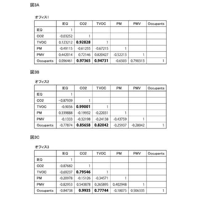 図3Aから図3Cは、室内空間となるオフィス1からオフィス3における各測定項目間の相関係数を示す図である。