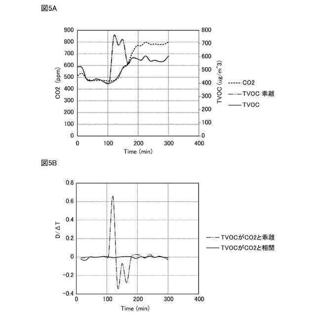 CO2濃度とTVOC濃度とが連動する様子を示す図である。図5Aは、CO2濃度及びTVOC濃度の時間推移を示す図である。図5Bは、標準化したCO2濃度とTVOC濃度の差の二乗に対する時間微分の推移を示す図である。