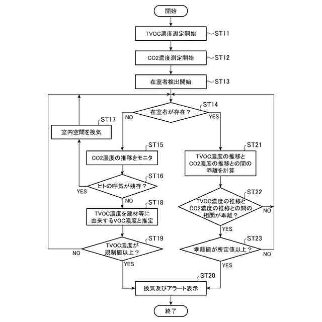 前記室内空間に在室者が存在する場合、CO2濃度の推移と、TVOC濃度の推移とに基づいて、TVOC濃度にVOC濃度が含まれているか否かを判定する