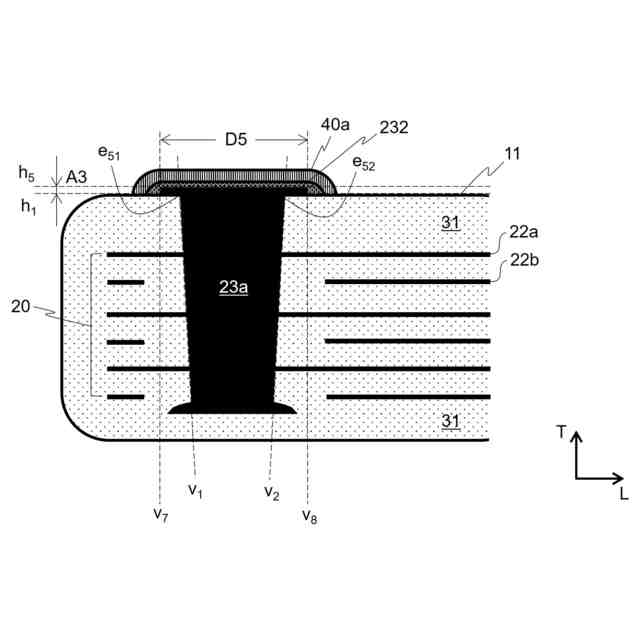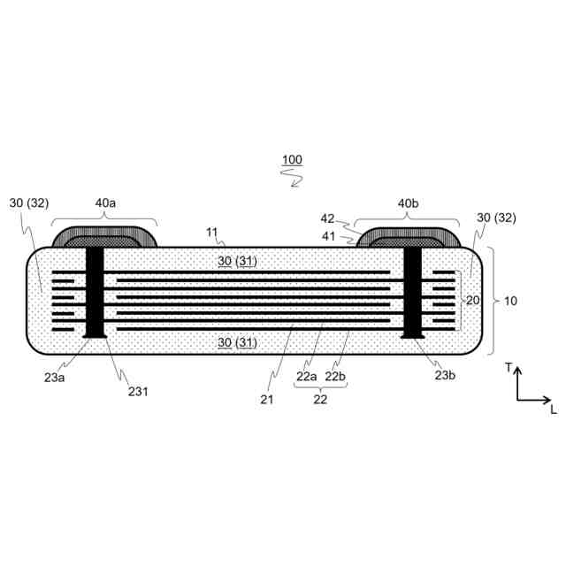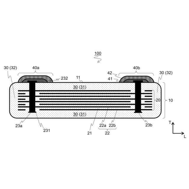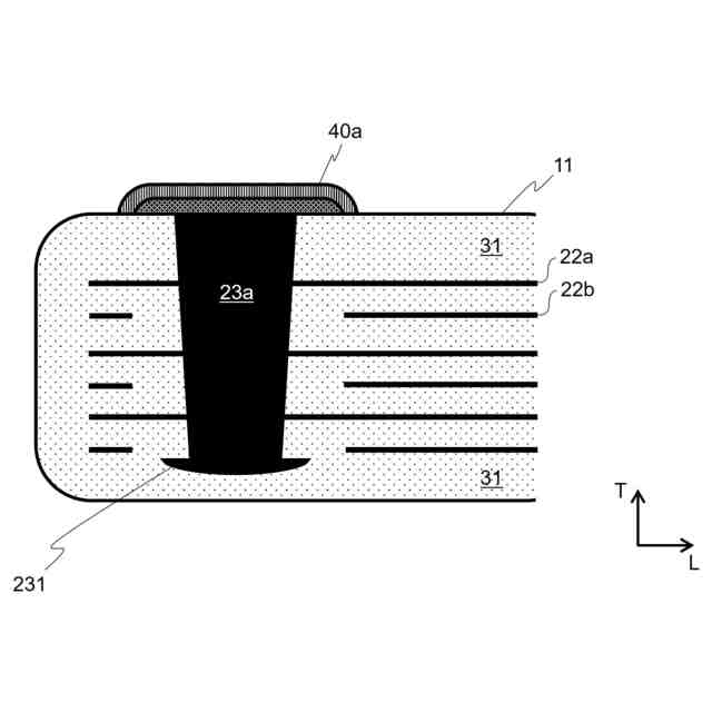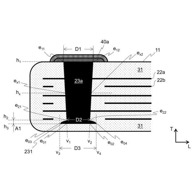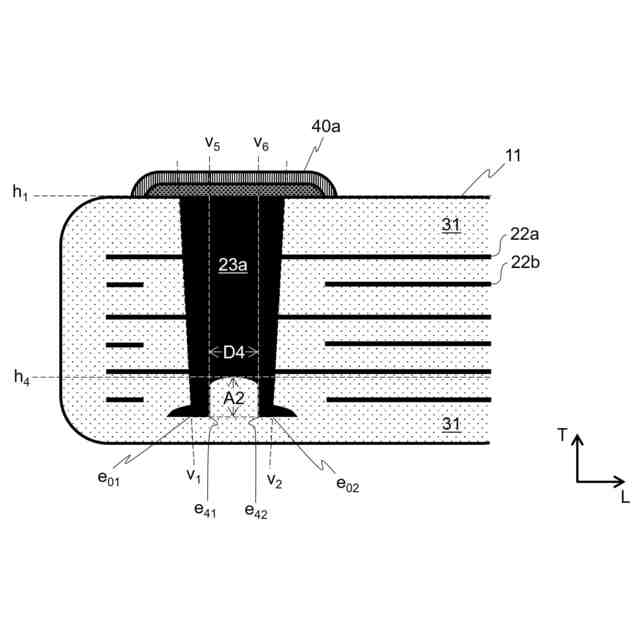 特許文献1には、ESL特性及び充填率を向上させるとともに、デラミネーションを減少させることができる積層セラミックキャパシタが開示されている。特許文献1では、積層セラミックキャパシタの本体を貫通する貫通電極を、断面が台形状であるテーパーを含むものとすることで、外力によるカバーの押され現象を改善して、ESL特性を向上させることができるとされている。また、特許文献1では、貫通電極の直径を調節することにより、ビアのペースト充填性を改善させて、充填率を向上させることができるとされている。