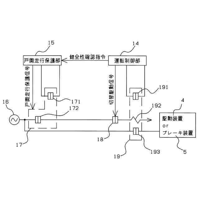 【解決手段】運転制御部14は、第3給電切換手段19の動作状況を監視するとともに、第3給電切換手段19に対して駆動装置4又はブレーキ装置5との接続回路を開放させる切換駆動信号を出力した上で、戸開走行保護部15に対して第2給電切換手段17の健全性を診断させる健全性確認指令を出力し、戸開走行保護部15は、第2給電切換手段17の動作状況を監視するとともに、健全性確認指令に基づいて前記第2給電切換手段17に対して、戸開走行保護信号を出力し、第2給電切換手段17の動作状況と戸開走行保護信号とを比較することで第2給電切換手段17の健全性を診断する戸開走行保護装置健全性確認処理を実行する。