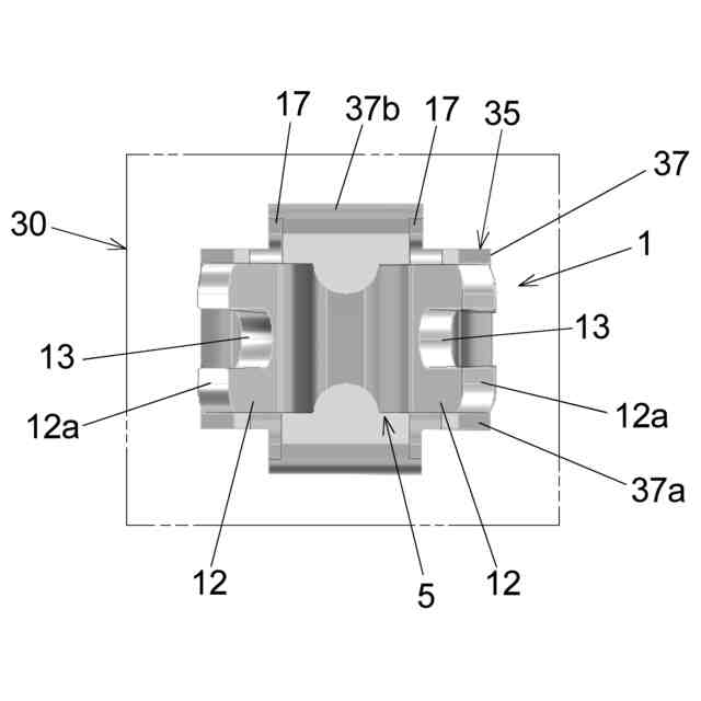 ソケット1であって、コンタクトプローブ5の一対の弾性片部の間隔を狭めた挿入状態における拡大平面図である。
