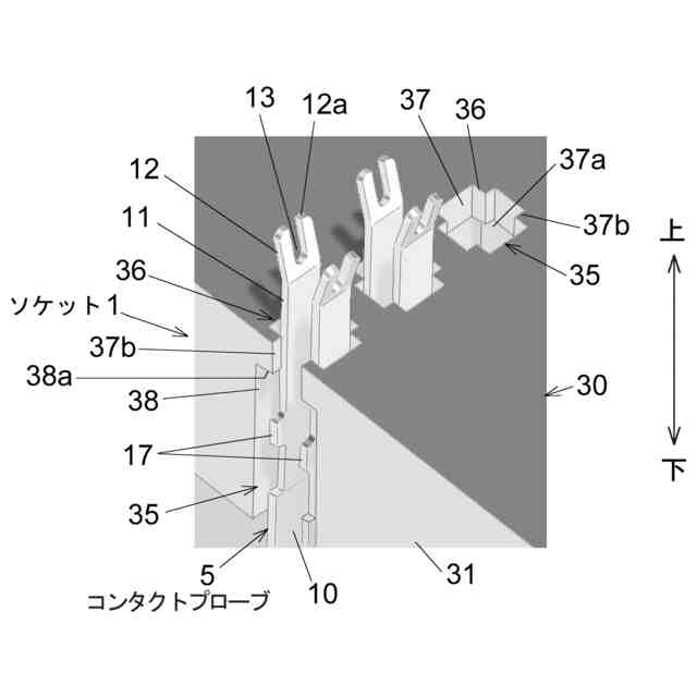 図1から図8を用いて本発明の実施形態1に係るソケット1を説明する。説明の便宜上、図1に上下方向を定義する。これらの図に示すように、ソケット1は、複数のコンタクトプローブ5と、非弾性で剛性を有する絶縁性硬質樹脂のハウジング部30と、ハウジング部30の底面に固定された検査用基板40と、を有している。各コンタクトプローブ5はハウジング部30に所定ピッチで形成された取付孔35にそれぞれ挿入、配置される。なお、検査用基板40の電極パッドの図示は省略してある。