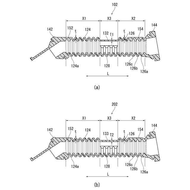 例えば特許文献1には、剛性部、徐変部、蛇腹部を有するコルゲートチューブが開示されている。そして、剛性部は、蛇腹で構成された第1の半周部分と、ストレートに形成された第2の半周部分と、を有している。この中で第1の半周部分があることにより、スライドドアが半開状態になるときの剛性部の屈曲を抑制し、剛性部のウェザーストリップへの干渉を抑制することができる、と特許文献1は述べている。