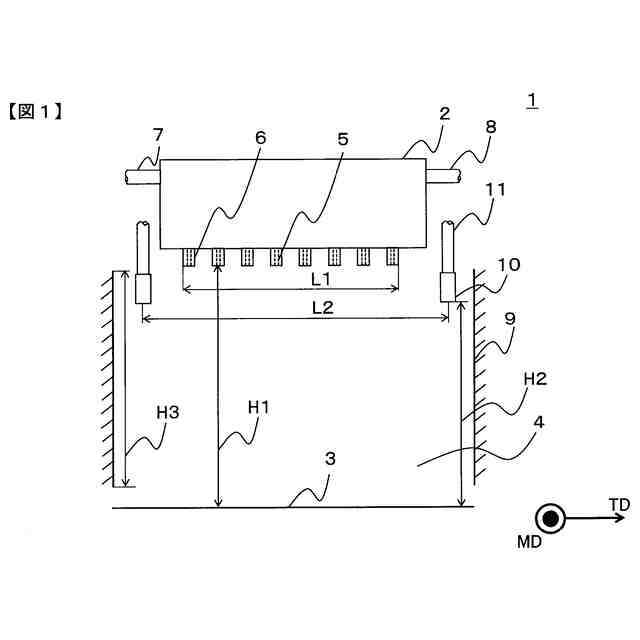 従来の不織布の製造装置においては、ポリマーとエアーを口金から吐出し捕集するまでに、捕集部に向かう空気の流速が周囲空気や壁面との摩擦抵抗により不織布幅方向の端部から減衰する。そのため、不織布幅方向において中央の流速が高くなると同時に、中央で単位時間当たりに捕集部へ流れるポリマーの質量密度が高くなる。そうして、捕集された後の不織布は幅方向中央においては目付が高く厚みがあり、幅方向端部は中央に対して目付が低い状態となる。また、ポリマーによっては、ノズルから捕集部までの距離が長くせざるを得ない場合がある。この場合、幅方向端部の流速がさらに低下するため、中央と端部の目付および厚みの差は顕著となる。このように従来の不織布の製造装置では、目付および厚みの均一性が低下した不織布となり、強度や濾過性能等が損なわれる。