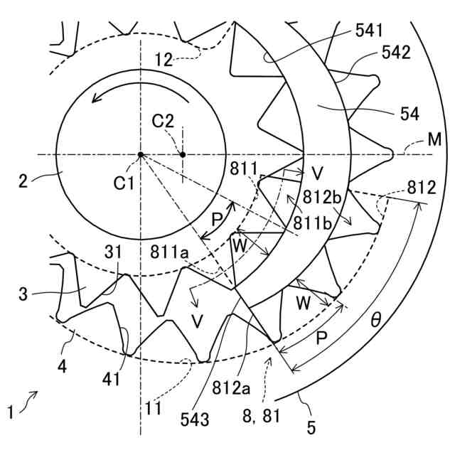 前記クリセントは、前記外歯が当接する第1円弧壁と、前記内歯が当接する第2円弧壁とを有し、
