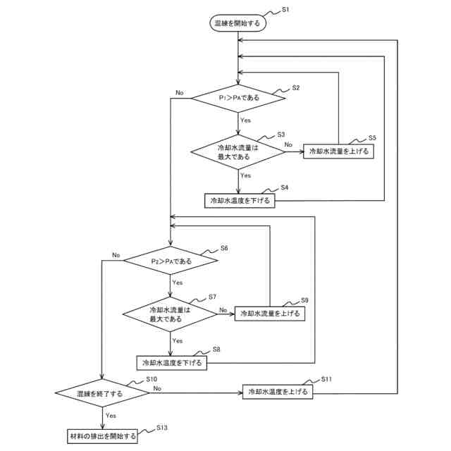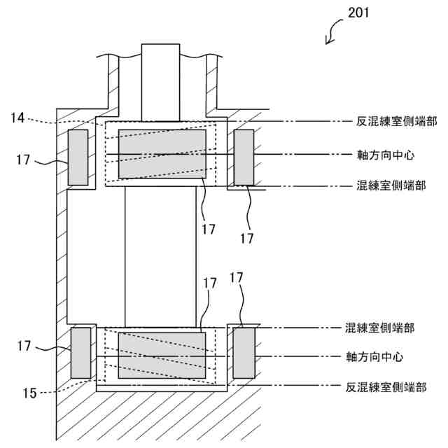 【解決手段】材料の混練が行われる混練室18を有するチャンバ2と、チャンバ2内に設けられたロータ3と、戻し部14、15と、を有し、戻し部14、15にはねじが形成されており、戻し部14、15はロータ3と共に回転することで、戻し部14、15から混練室側に材料を押し出すように構成されており、チャンバ2および戻し部14、15または両方に、チャンバ2と戻し部14、15との間に存在する材料を冷却する冷却機構(冷却装置17)が設けられる。