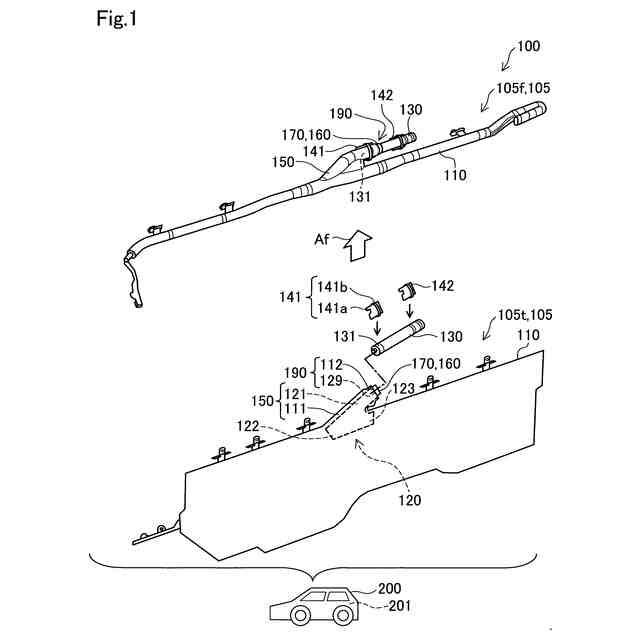 エアバッグ105は、カーテンエアバッグ装置100の作動時において、インフレータ130から膨張用ガスを供給されることにより、膨張し展開する。エアバッグ105が展開した状態のことを、展開状態ともいう。また、以下では、「カーテンエアバッグ装置100の作動時」のことを、単に、「作動時」ともいう。エアバッグ105は、カーテンエアバッグ装置100が作動していない通常時には、折り畳み状態を取る。折り畳み状態は、エアバッグ105が展開されておらず折り畳まれた状態を意味する。図1には、折り畳み状態におけるエアバッグ105fと、展開状態におけるエアバッグ105tとが示されている。具体的には、図1の矢印Afによって示すように、エアバッグ105は、展開状態から、下端を含む一部を上に向かって巻かれ、上端を含む他の一部をジグザグに折り畳まれることで折り畳み状態をとる。
