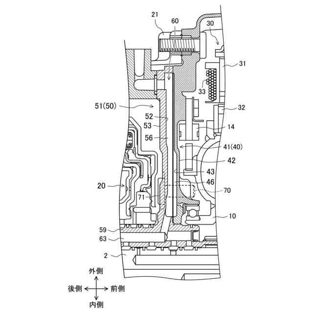 第1の態様では、第1部品は、軸方向において、第1通路から離しつつ第2通路に近づけて配置可能である。一方、第2部品は、軸方向において、第2通路から離しつつ第1通路に近づけて配置可能である。これにより、第1部品及び第2部品と油路との干渉を回避しながらも、軸方向のサイズを小さくできる。したがって、自動変速機の大型化を抑制できる。